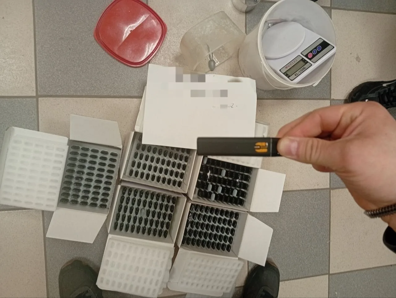 При обыске в офисе, который фигурантка использовала для фасовки и упаковки наркотиков, полицейские обнаружили в ведре два сверка с запрещенным веществом, а также коробки с электронными сигаретами. Также был изъяты весы и упаковочные материалы.
