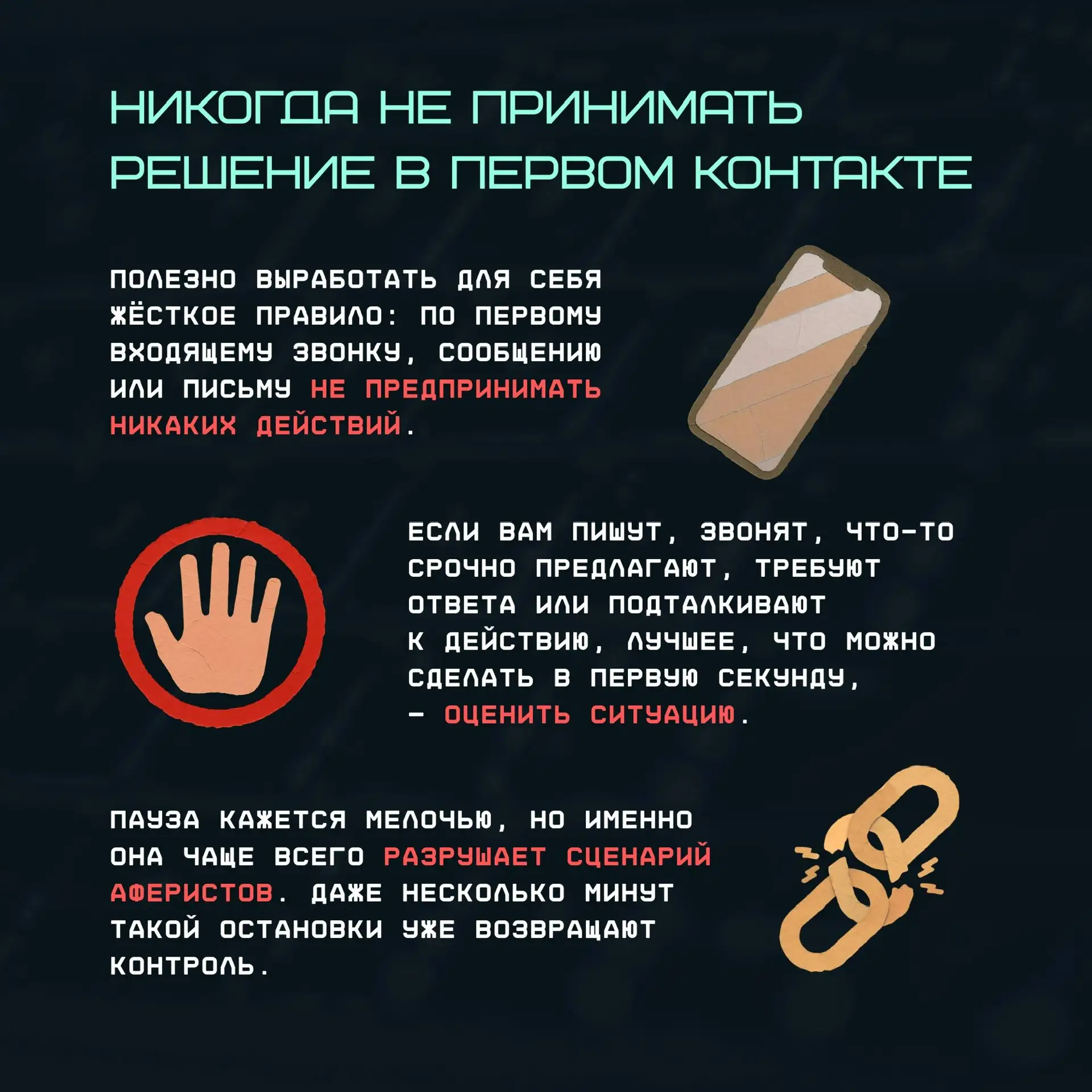 Часто мошенники используют не сложные технологии, а человеческую психологию — спешку, доверие, усталость и другие эмоциональные состояния. Именно поэтому защита предполагает не только программу-антивирус или двухфакторную аутентификацию, но и привычки, которые помогают вовремя остановиться, перепроверить информацию и сохранить контроль над ситуацией.
