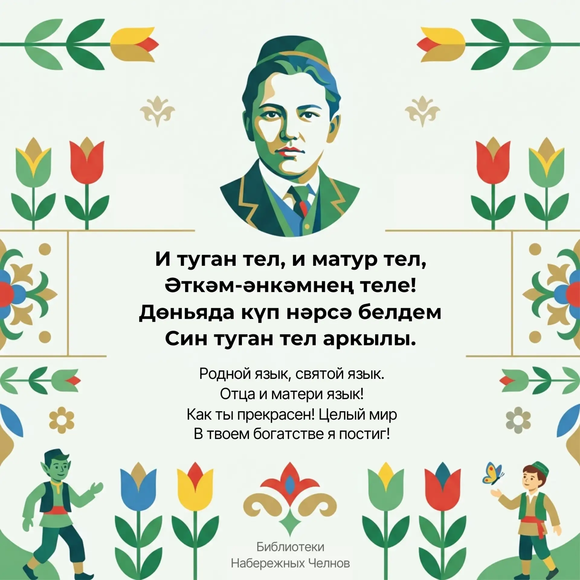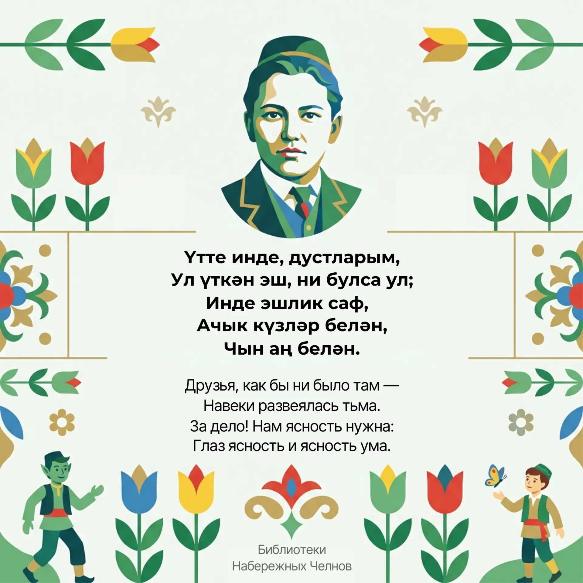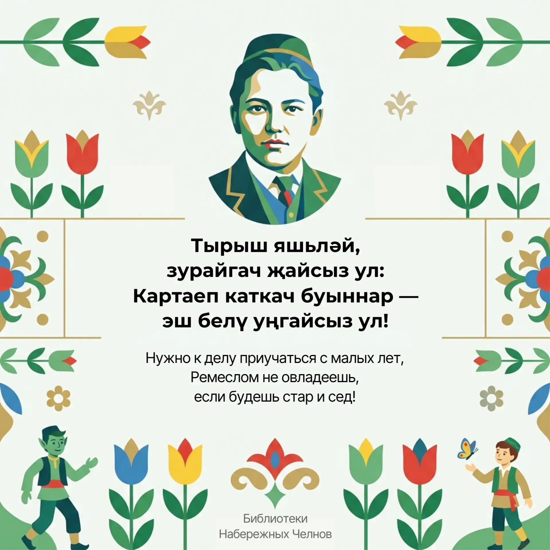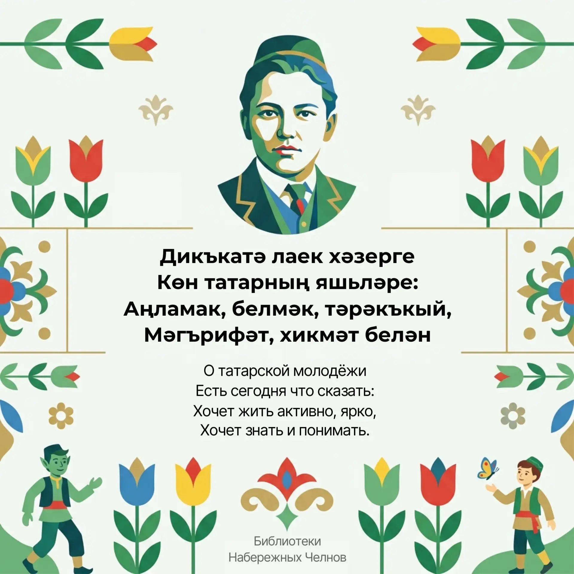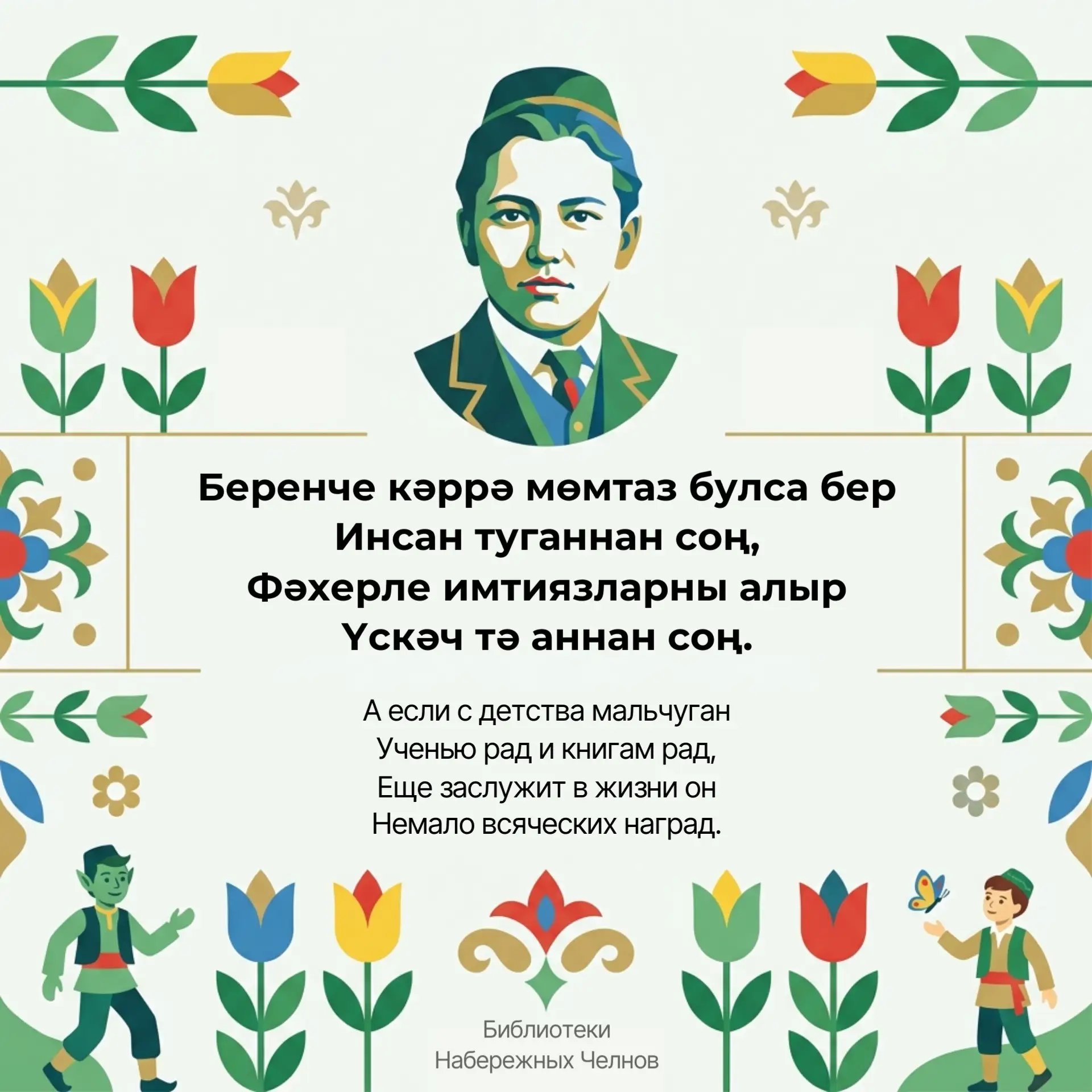 Библиотеки Набережных Челнов подготовили для вас карточки с мудрыми строками поэта — на татарском и русском языках.