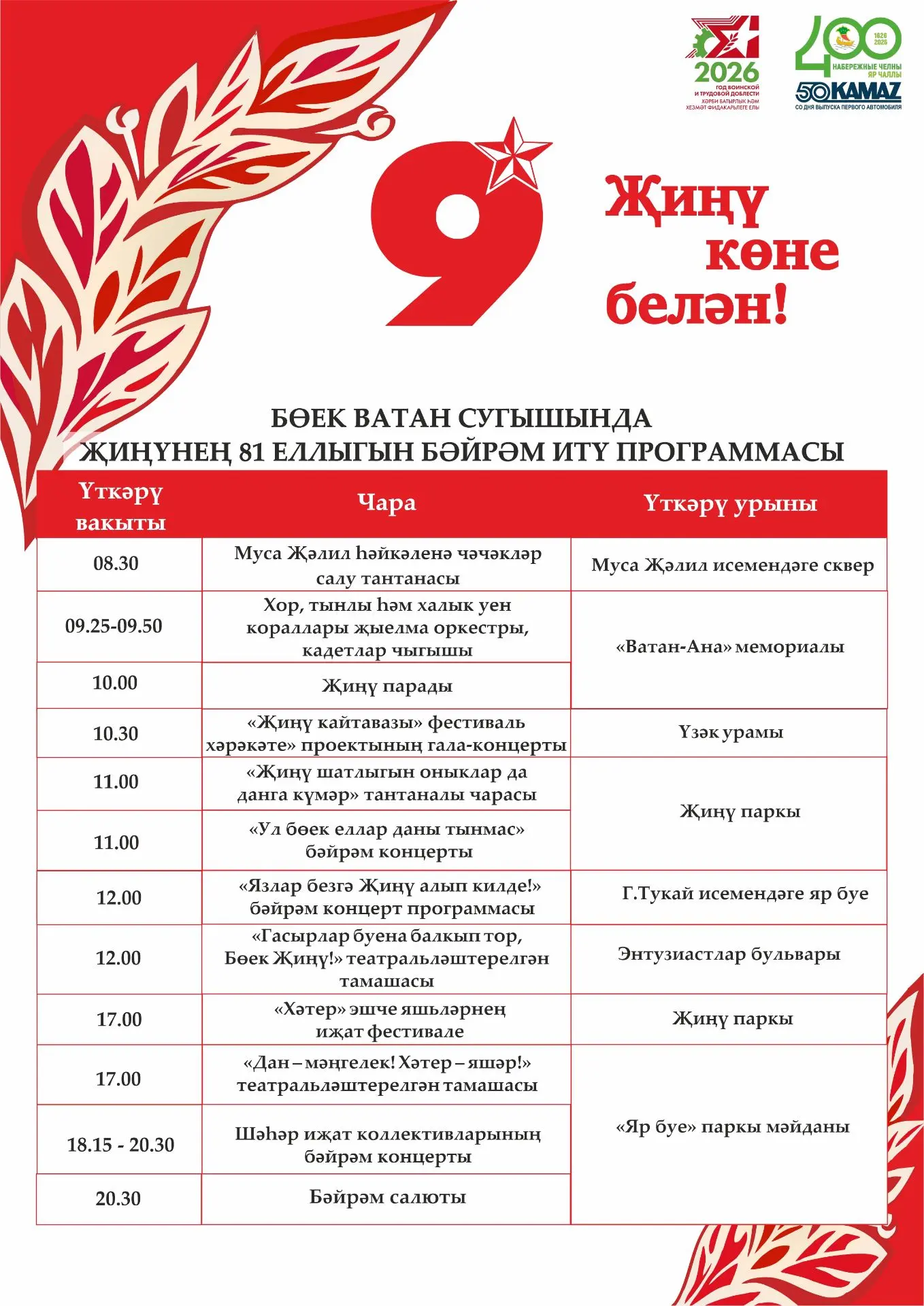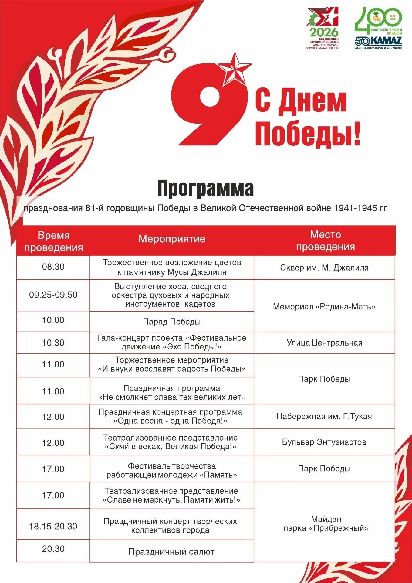 В 10:00 на проспекте Мусы Джалиля у мемориала «Родина-мать» — торжественный Парад Победы: 41 парадный расчёт, техника времён ВОВ и техника, которая сегодня производится в Набережных Челнах для Вооружённых Сил России. После парада — возложение венков и цветов.