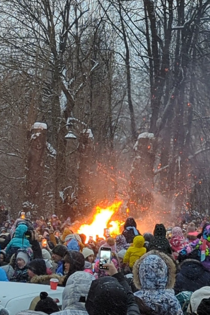 Сжигание чучела привлекло много зрителей, которые занимали лучшие места заранее. Хотя подождать в очереди час не решились, находясь на небольшой горке, удалось увидеть костер и настроение праздника.