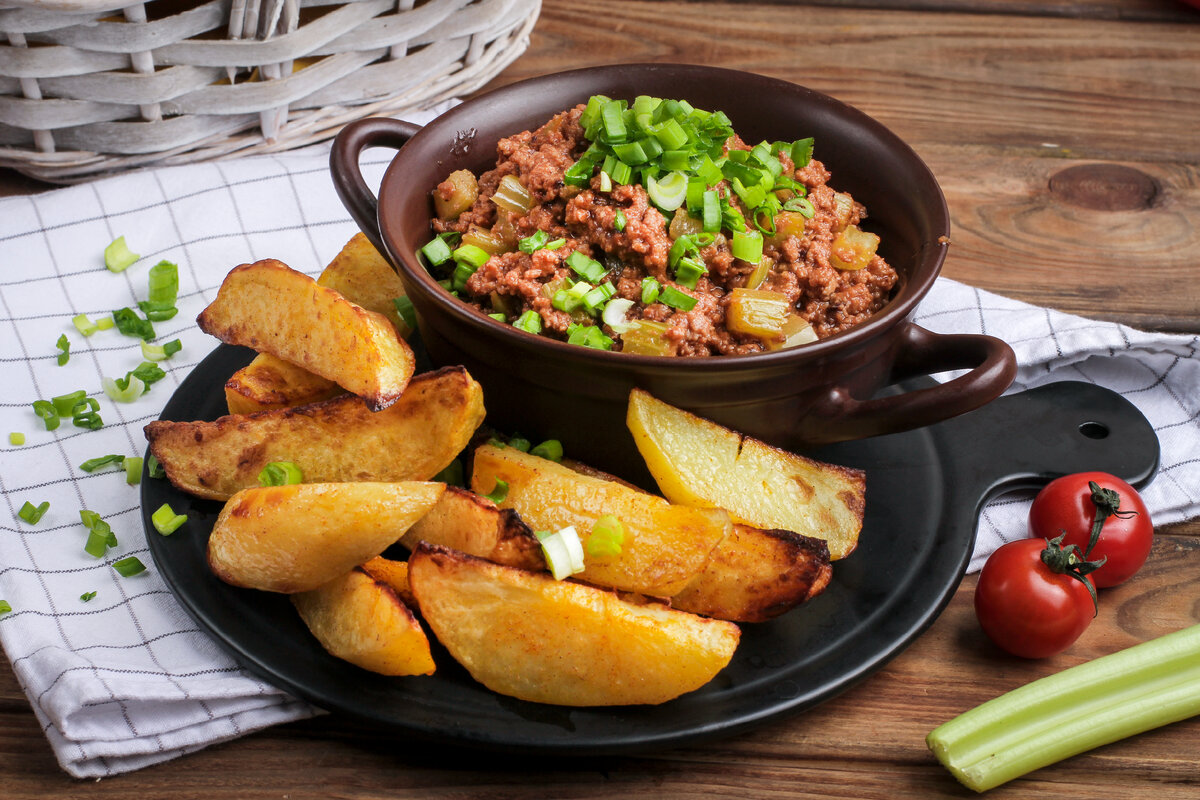 Шаг 1: Установите духовку на 200 градусов. Картофель не очищайте, просто промойте и нарежьте дольками. Приправьте его солью, перцем и полейте растительным маслом. Запекайте в течение 20-25 минут, следите за тем, чтобы не пересушить. Пока картофель запекается, нарежьте сельдерей мелкими кубиками. Разогрейте сковороду с 1 столовой ложкой масла и обжарьте сельдерей около 2-3 минут. Затем добавьте фарш и готовьте еще 3 минуты. Влейте протёртые томаты, добавьте луковый порошок и уксус, перемешайте, и продолжайте готовить еще 4-5 минут.