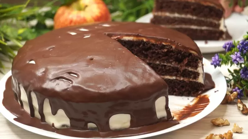 Тем временем готовится глазурь: растопленный шоколад смешивается со сливками до получения однородной массы, которая затем аккуратно поливается сверху торта. Для достижения идеальной консистенции рекомендуется дать торту настояться и пропитаться ароматами при комнатной температуре в течение 2-3 часов.