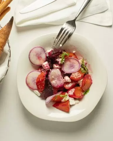 Необычное сочетание свеклы и феты раскрывается здесь в свежем и тонком исполнении. Этот салат — настоящее наслаждение для любителей легких и полезных закусок.
