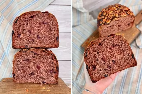 - Тесто: 550-600 г муки, 160 г сахара, 190 г растопленного масла, 330 г яиц, щепотка соли, 1/2 стручка ванили, 100 г сушеных фруктов и 120 г горького шоколада.