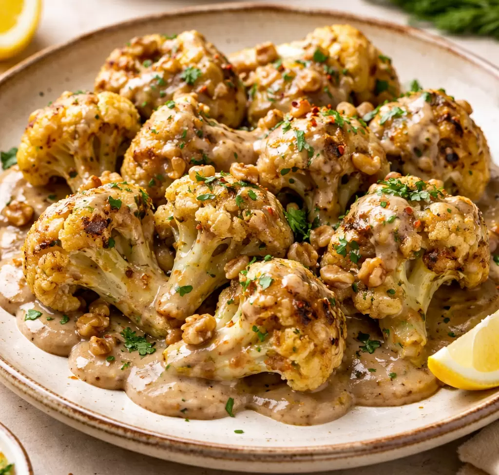 Доставайте запеченную капусту, обильно полейте ее ореховым соусом и верните в верхнюю часть духовки на 5 минут, чтобы она подрумянилась. Подавайте горячим, заранее украсив блюдо рубленой зеленью.