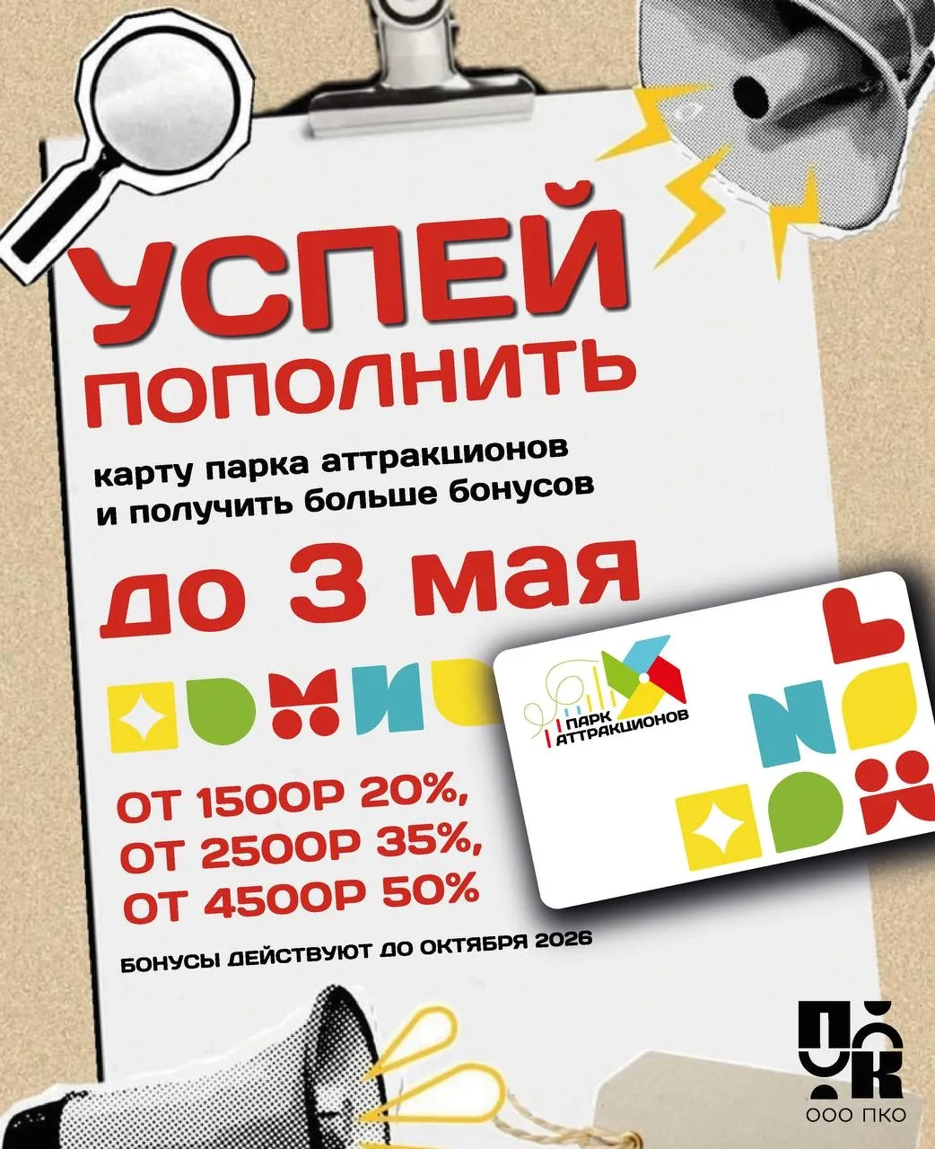При пополнении карты парка аттракционов до 3 мая 2026 года получите БОЛЬШИЕ бонусы, которые будут активны до конца сезона: