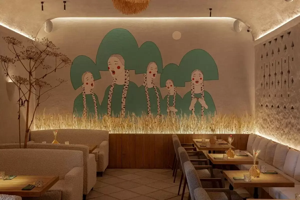 Интерьер «Ёшки Матрёшки» погружает посетителей в атмосферу русской культурной традиции. Выбеленные стены, деревянные элементы, плетёные декоры и изображения девушек в кокошниках — всё это создает уютное пространство для гостей. Для комфортного времяпрепровождения предусмотрены мягкие диваны и кресла.