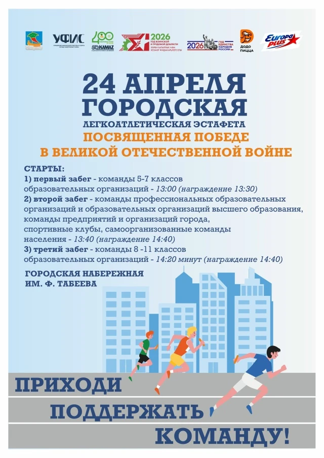 Собирайте команду и готовьтесь к главному забегу весны! 24 апреля мы встречаемся на набережной Табеева, чтобы пробежать традиционную эстафету в честь 81-й годовщины Великой Победы.