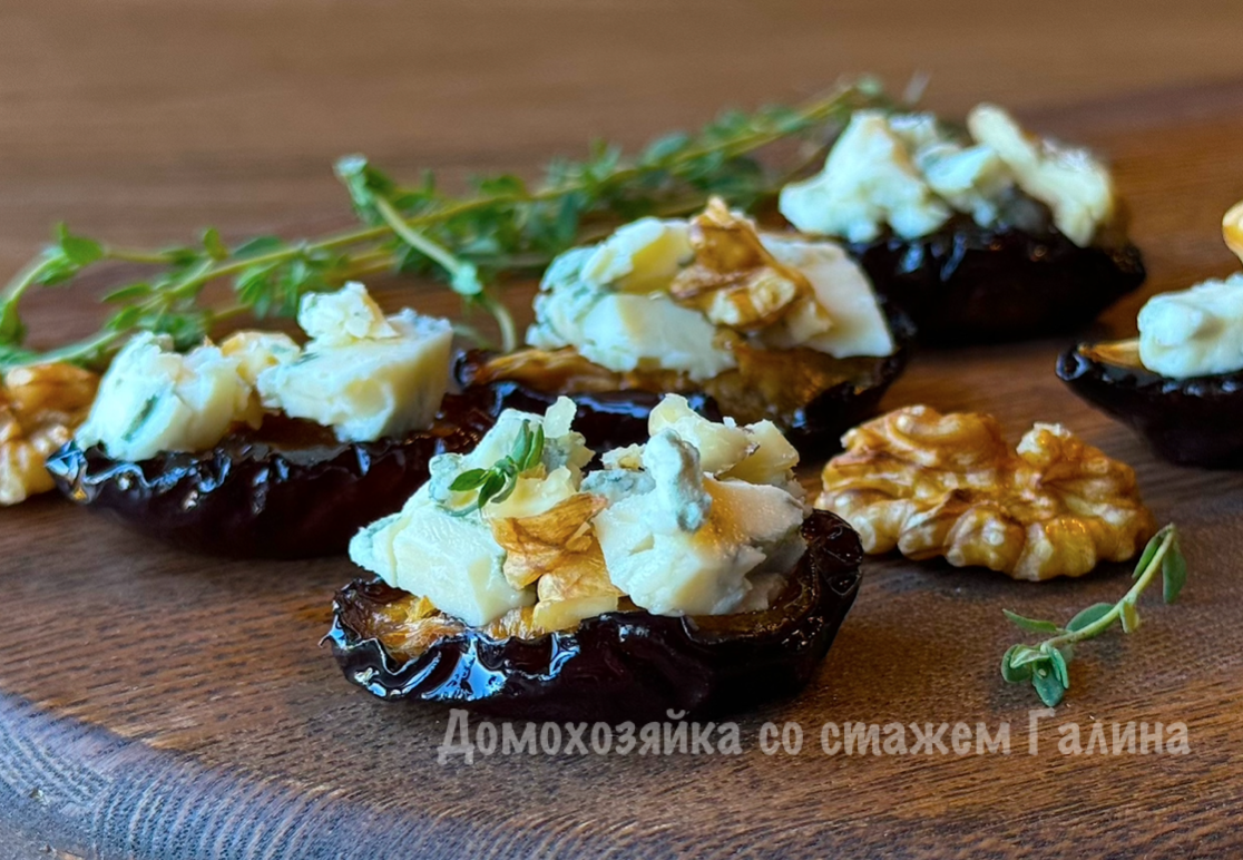 После этого поддоны ставят в сушилку, устанавливая температуру 55 градусов на 12 часов. Важно периодически проверять мякоть слив: они должны оставаться мягкими и не выделять сок. Когда вяленые сливы готовы, их выкладывают кожицей вниз на блюдо, добавляя кусочки сыра с голубой плесенью и грецкие орехи.