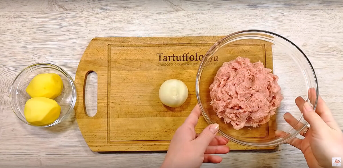 Далее, картофелины нарезают тонкими брусочками. Использовать терку не рекомендуется, так как важно сохранить текстуру картофеля, чтобы он ощущался в каждой котлете. После этого подготовленный картофель отправляется к мясу.