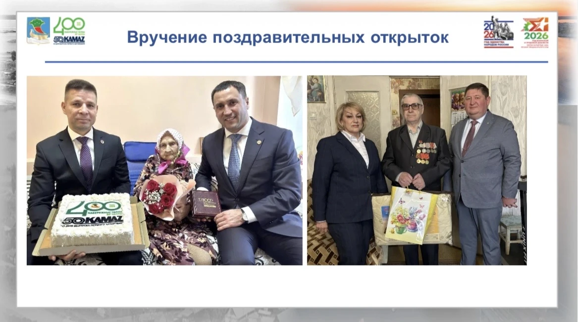 Ветераны получают продуктовые наборы от Раиса Республики Татарстана Рустама Минниханова. Также юбилярам ежемесячно вручают именные открытки от Президента России Владимира Путина и Раиса Республики Татарстан.