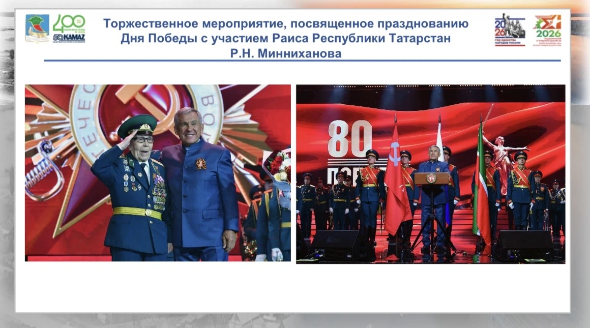 Торжественные мероприятия с участием ветеранов пройдут 7 и 8 мая. Так, 7 мая состоится праздничное событие в Казани с участием Рустама Минниханова, а в Набережных Челнах ветеранов лично поздравит мэр города Наиль Магдеев. На следующий день, 8 мая, мэр города посетит старшее поколение в госпитале для ветеранов войн.
