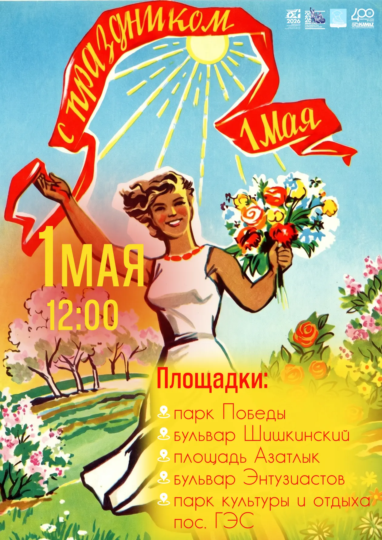 Концерт «Челны встречают Первомай!» от артистов ДК «КАМАЗ», театра танца «Булгары» и участников проекта «Челны ТОП-13». Гостей ждут викторины, выставки и мастер-классы от картинной галереи.